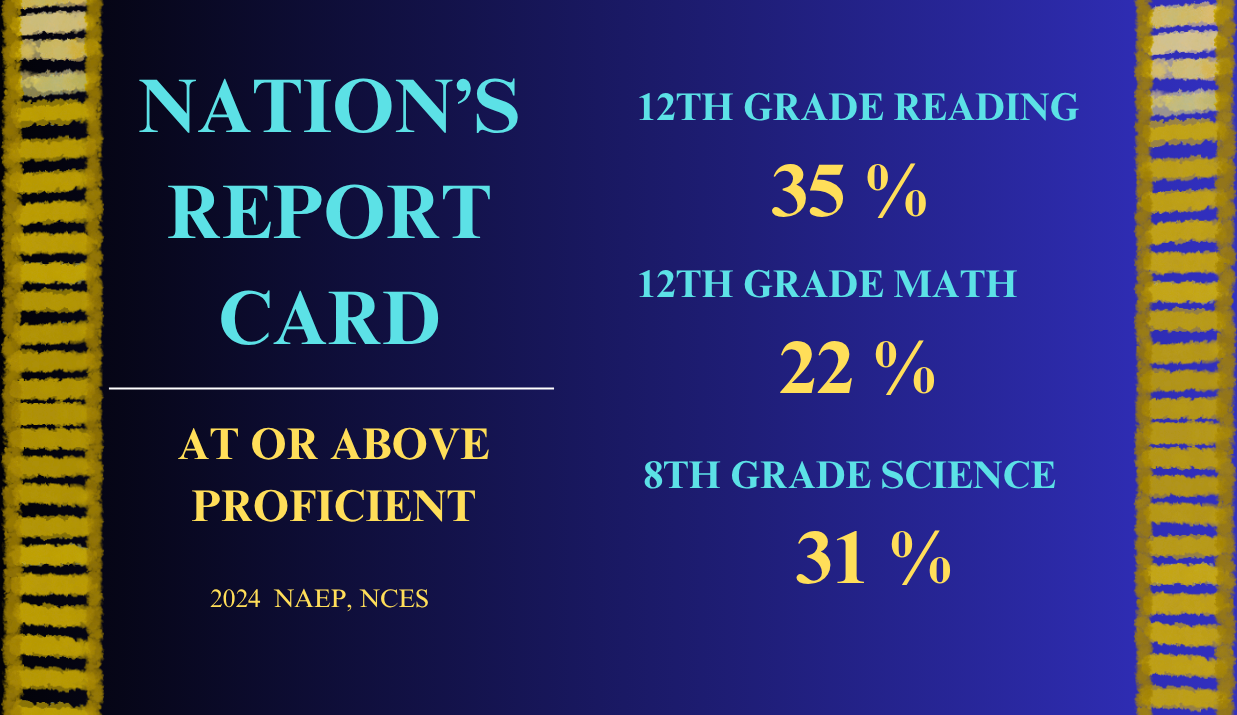 The 2024 Nation’s Report card issued its biannual report on test scores for students entering (9th grade) and exiting (12th grade) high school. The NY Times reports reading skills of seniors are the worst seen in three decades.